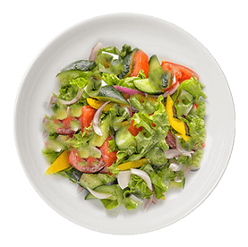 Salade, tomates, oignons, olives, carottes râpées, maïs, chèvre.